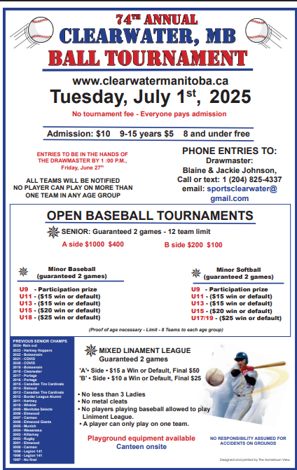 We're excited to invite you to the 74 Ball Tournament on July 1, 2025 in Clearwater, Manitoba!